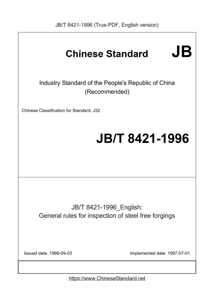 Delivery: <= 4 days. True-PDF full-copy in English will be manually translated and delivered via email. JB/T 8421-1996: General rules for inspection of steel free forgings Status: Obsolete