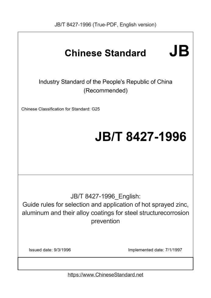 Delivery: <= 4 days. True-PDF full-copy in English will be manually translated and delivered via email. JB/T 8427-1996: Guide rules for selection and application of hot sprayed zinc, aluminum and their alloy coatings for steel structurecorrosion prevention Status: Obsolete