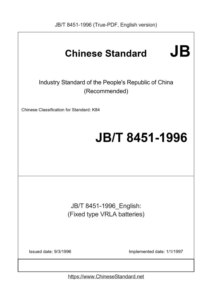 Delivery: <= 4 days. True-PDF full-copy in English will be manually translated and delivered via email. JB/T 8451-1996: (Fixed type VRLA batteries) Status: Obsolete
