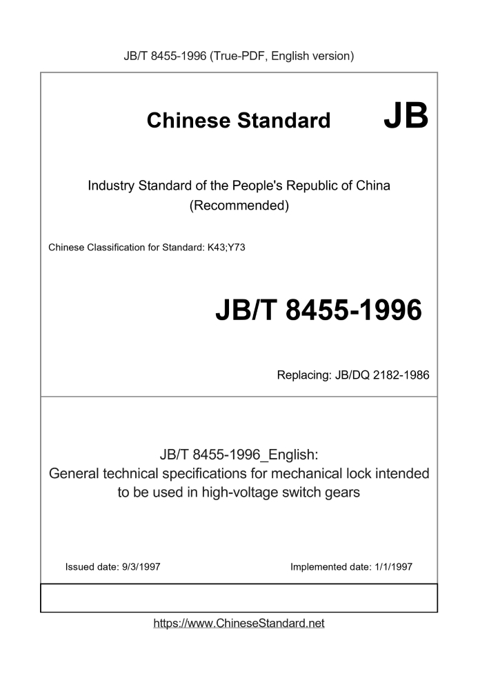 Delivery: <= 2 days. True-PDF full-copy in English will be manually translated and delivered via email. JB/T 8455-1996: General technical specifications for mechanical lock intended to be used in high-voltage switch gears Status: Obsolete