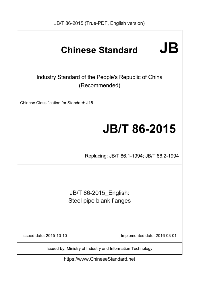 Delivery: <= 4 days. True-PDF full-copy in English will be manually translated and delivered via email. JB/T 86-2015: Steel pipe blank flanges Status: Valid JB/T 86: Historical versions