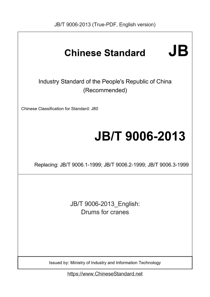 Delivery: <= 3 days. True-PDF full-copy in English will be manually translated and delivered via email. JB/T 9006-2013: Drums for cranes Status: Valid JB/T 9006: Historical versions