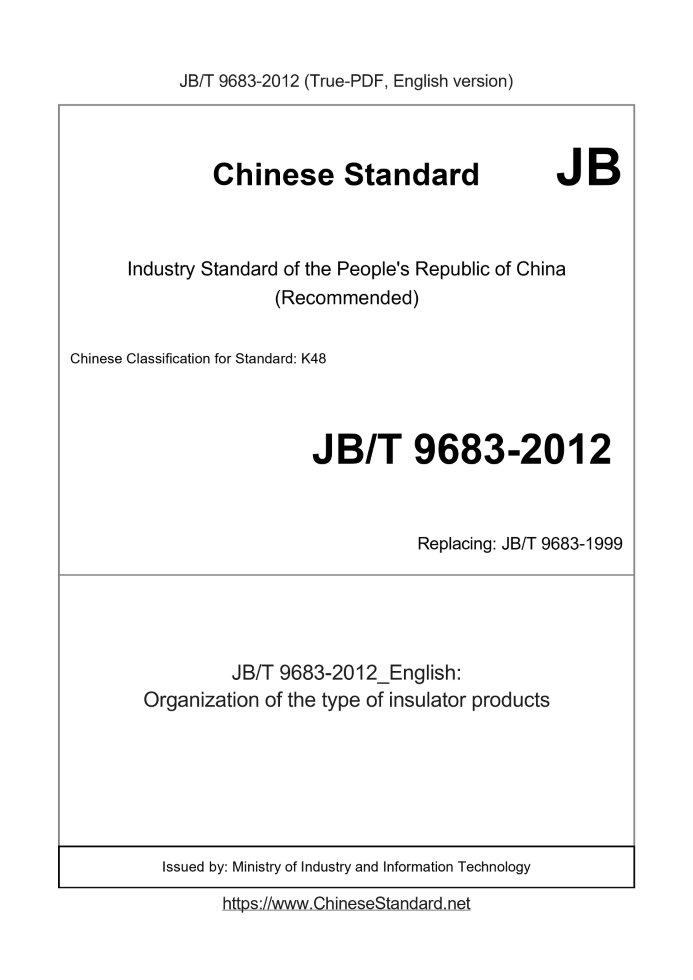 Delivery: <= 3 days. True-PDF full-copy in English will be manually translated and delivered via email. JB/T 9683-2012: Organization of the type of insulator products Status: Valid JB/T 9683: Historical versions