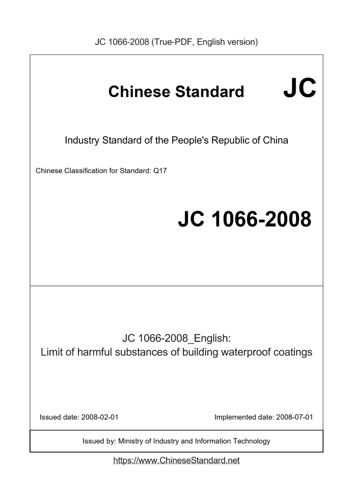Delivery: <= 3 days. True-PDF full-copy in English will be manually translated and delivered via email. JC 1066-2008: Limit of harmful substances of building waterproof coatings Status: Valid