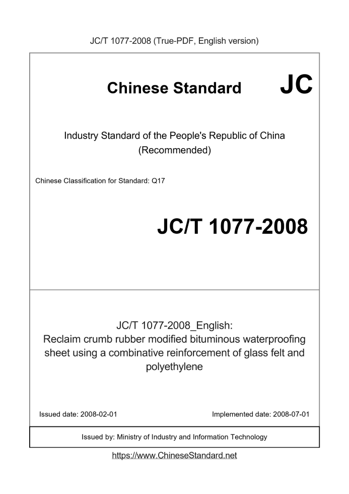 Delivery: <= 3 days. True-PDF full-copy in English will be manually translated and delivered via email. JC/T 1077-2008: Reclaim crumb rubber modified bituminous waterproofing sheet using a combinative reinforcement of glass felt and polyethylene Status: Valid
