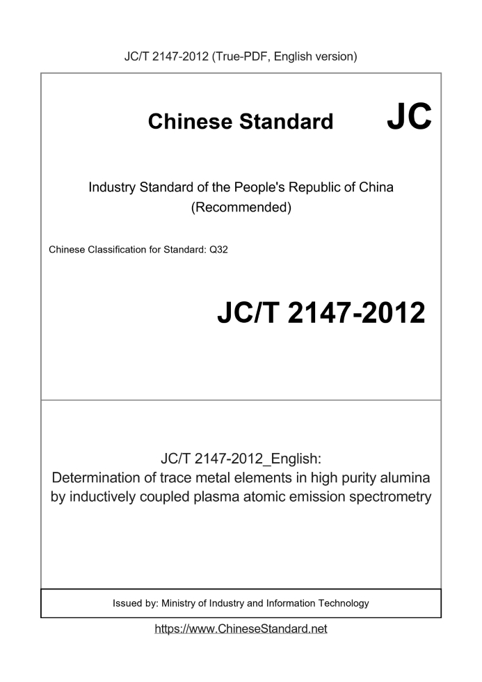 | JC/T 2147-2012 English PDFUS$239.00 ยท In stock Delivery: <= 3 days. True-PDF full-copy in English will be manually translated and delivered via email. JC/T 2147-2012: Determination of trace metal elements in high purity alumina by inductively coupled plasma atomic emission spectrometry Status: Valid