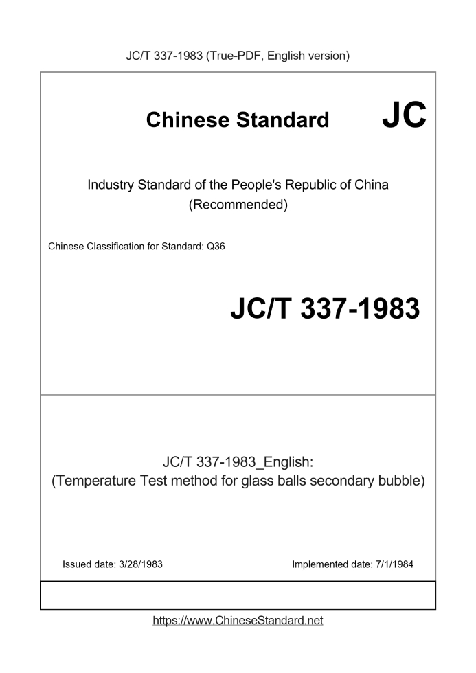 Delivery: <= 2 days. True-PDF full-copy in English will be manually translated and delivered via email. JC/T 337-1983: (Temperature Test method for glass balls secondary bubble) Status: Obsolete