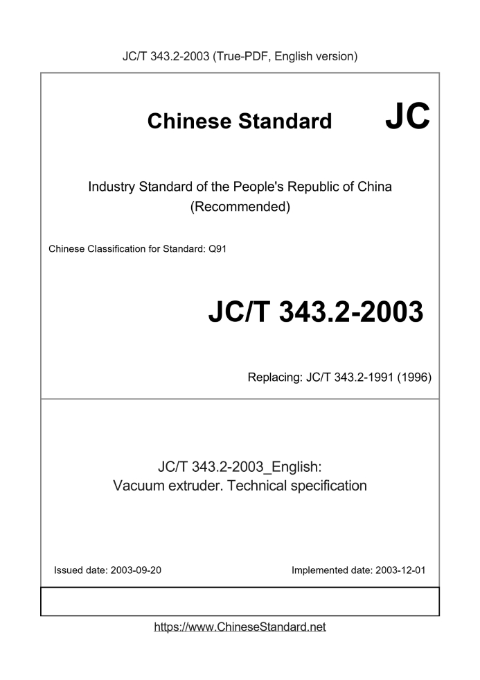 | JC/T 343.2-2003 English PDFUS$199.00 ยท In stock Delivery: <= 2 days. True-PDF full-copy in English will be manually translated and delivered via email. JC/T 343.2-2003: Vacuum extruder. Technical specification Status: Obsolete JC/T 343.2: Historical versions