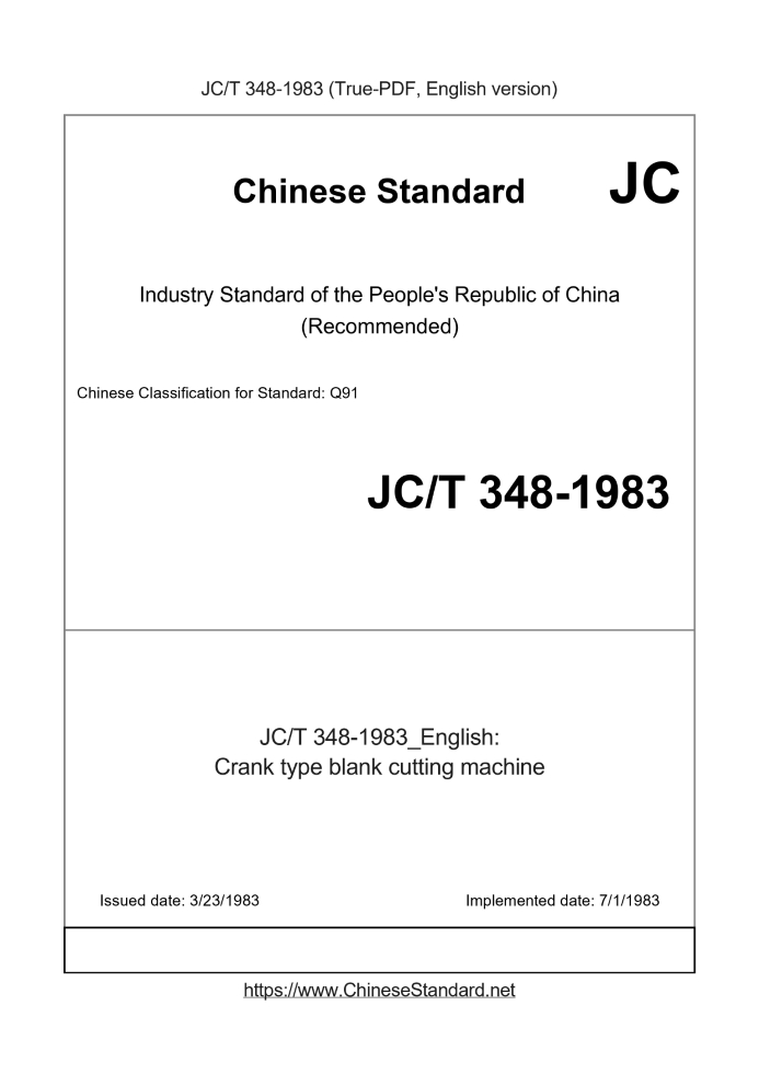 Delivery: <= 3 days. True-PDF full-copy in English will be manually translated and delivered via email. JC/T 348-1983: Crank type blank cutting machine Status: Obsolete