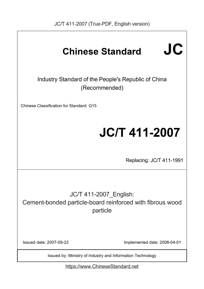| JC/T 411-2007 English PDFUS$769.00 ยท In stock Delivery: <= 5 days. True-PDF full-copy in English will be manually translated and delivered via email. JC/T 411-2007: Cement-bonded particle-board reinforced with fibrous wood particle Status: Valid JC/T 411: Historical versions
