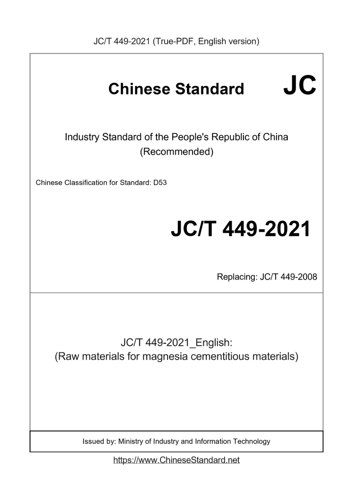 Delivery: <= 3 days. True-PDF full-copy in English will be manually translated and delivered via email. JC/T 449-2021: (Raw materials for magnesia cementitious materials) Status: Valid JC/T 449: Historical versions