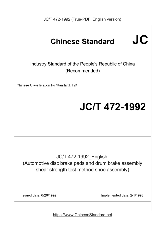 Delivery: <= 2 days. True-PDF full-copy in English will be manually translated and delivered via email. JC/T 472-1992: (Automotive disc brake pads and drum brake assembly shear strength test method shoe assembly) Status: Obsolete