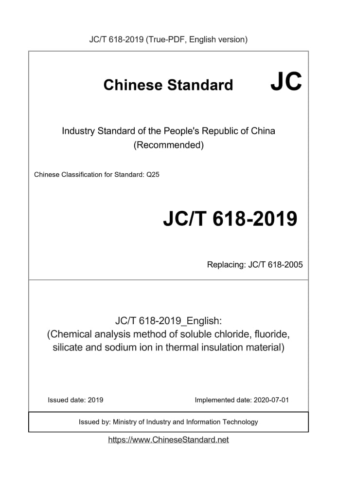 Delivery: <= 4 days. True-PDF full-copy in English will be manually translated and delivered via email. JC/T 618-2019: (Chemical analysis method of soluble chloride, fluoride, silicate and sodium ion in thermal insulation material) Status: Valid JC/T 618: Historical versions
