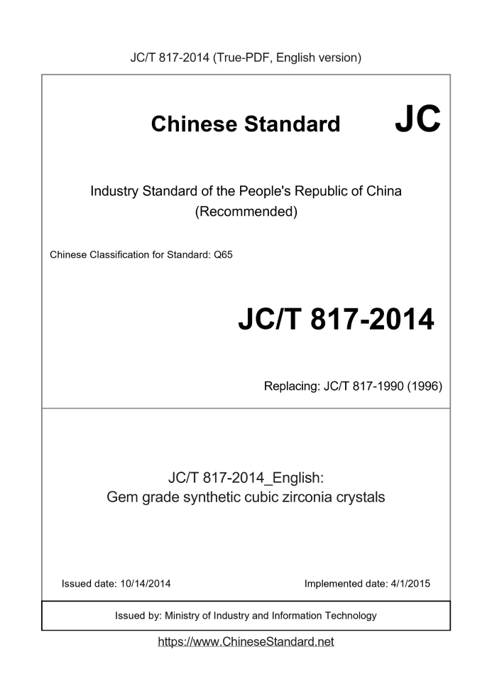 Delivery: <= 3 days. True-PDF full-copy in English will be manually translated and delivered via email. JC/T 817-2014: Gem grade synthetic cubic zirconia crystals Status: Valid JC/T 817: Historical versions
