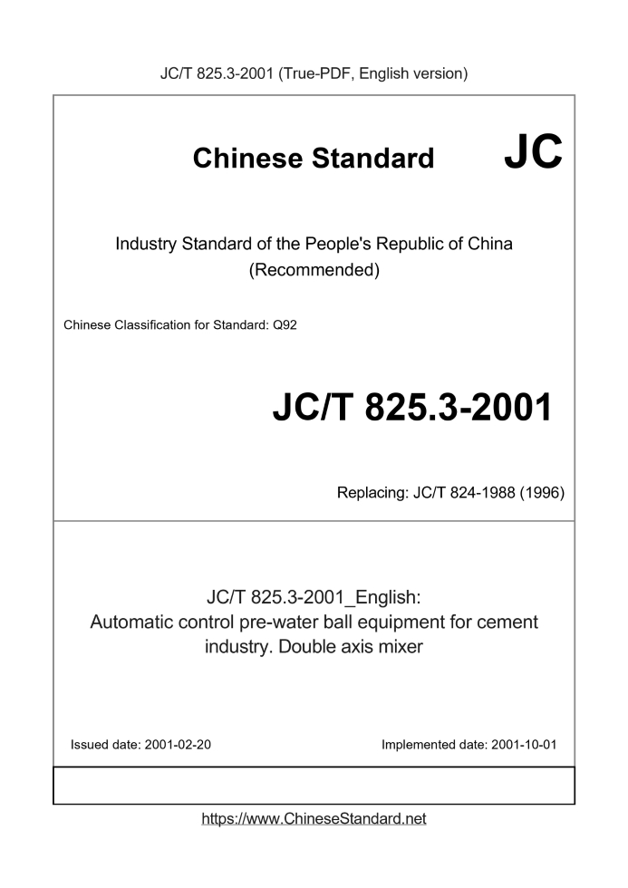 Delivery: <= 3 days. True-PDF full-copy in English will be manually translated and delivered via email. JC/T 825.3-2001: Automatic control pre-water ball equipment for cement industry. Double axis mixer Status: Obsolete