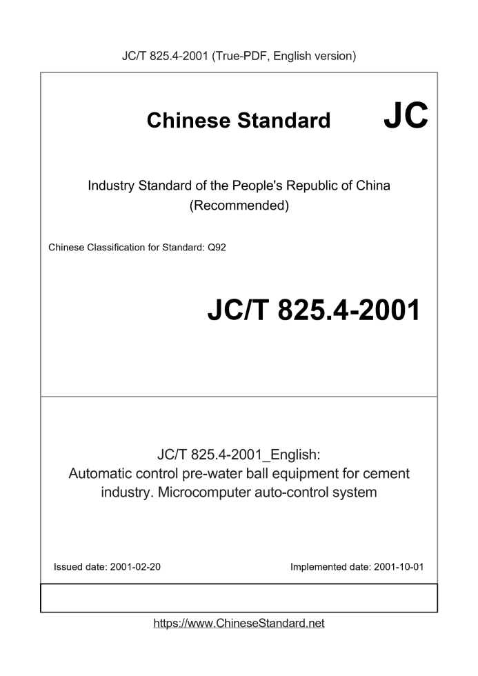 Delivery: <= 3 days. True-PDF full-copy in English will be manually translated and delivered via email. JC/T 825.4-2001: Automatic control pre-water ball equipment for cement industry. Microcomputer auto-control system Status: Obsolete