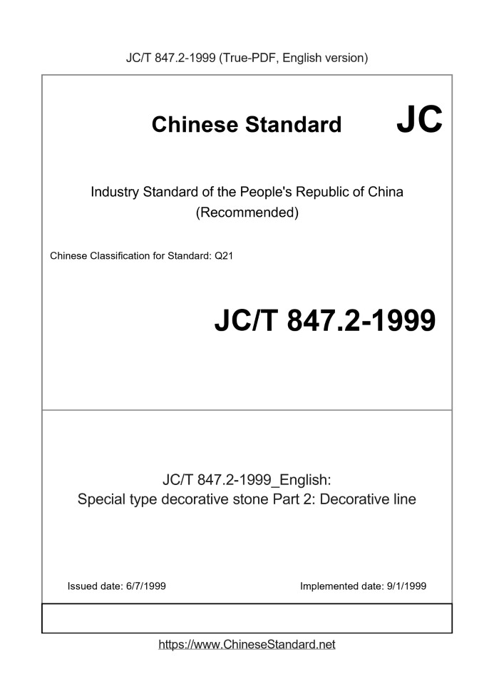 Delivery: <= 3 days. True-PDF full-copy in English will be manually translated and delivered via email. JC/T 847.2-1999: Special type decorative stone Part 2: Decorative line