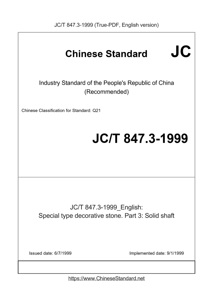 Delivery: <= 2 days. True-PDF full-copy in English will be manually translated and delivered via email. JC/T 847.3-1999: Special type decorative stone. Part 3: Solid shaft