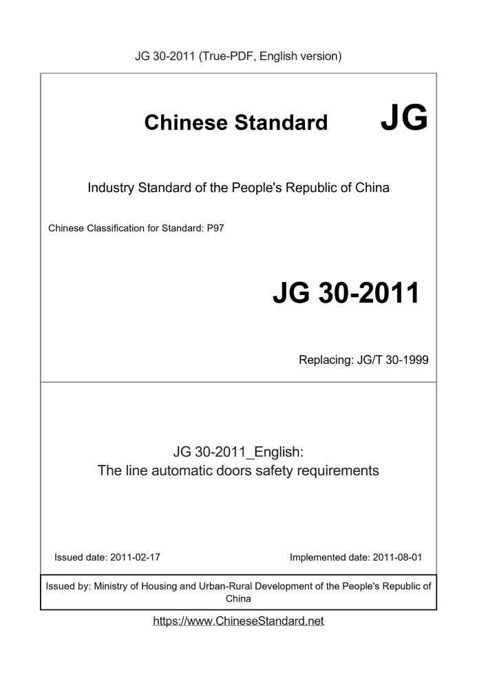 Basic dataStandard ID: JG 30-2011 (JG30-2011)Description (Translated English): The line automatic doors safety requirements Sector / Industry: Building & Construction Industry Standard Classification of Chinese Standard: P97 Date of Issue: 2011-02-17 Date of Implementation: 2011-08-01 Regulation (derived from): Industry standard filing Notice 2011 No. 9 (No. 141 overall) Issuing agency(ies): Ministry of Housing and Urban-Rural Development of the People's Republic of China Tips & Frequently Asked Questions:Question 1: How long will the true-PDF of JG 30-2011_English be delivered?Answer: Upon your order, we will start to translate JG 30-2011_English as soon as possible, and keep you informed of the progress. The lead time is typically 1 ~ 3 working days. The lengthier the document the longer the lead time.Question 2: Can I share the purchased PDF of JG 30-2011_English with my colleagues?Answer: Yes. The purchased PDF of JG 30-2011_English will be deemed to be sold to your employer/organization who actually pays for it, including your colleagues and your employer's intranet.Question 3: Does the price include tax/VAT?Answer: Yes. Our tax invoice, downloaded/delivered in 9 seconds, includes all tax/VAT and complies with 100+ countries' tax regulations (tax exempted in 100+ countries) -- See Avoidance of Double Taxation Agreements (DTAs): List of DTAs signed between Singapore and 100+ countriesQuestion 4: Do you accept my currency other than USD?Answer: Yes. If you need your currency to be printed on the invoice, please write an email to Sales@ChineseStandard.net. In 2 working-hours, we will create a special link for you to pay in any currencies. Otherwise, follow the normal steps: Add to Cart -- Checkout -- Select your currency to pay.Question 5: Should I purchase the latest version JG 30-2011?Answer: Yes. Unless special scenarios such as technical constraints or academic study, you should always prioritize to purchase the latest version JG 30-2011 even if the enforcement date is in future. Complying with the latest version means that, by default, it also complies with all the earlier versions, technically. |