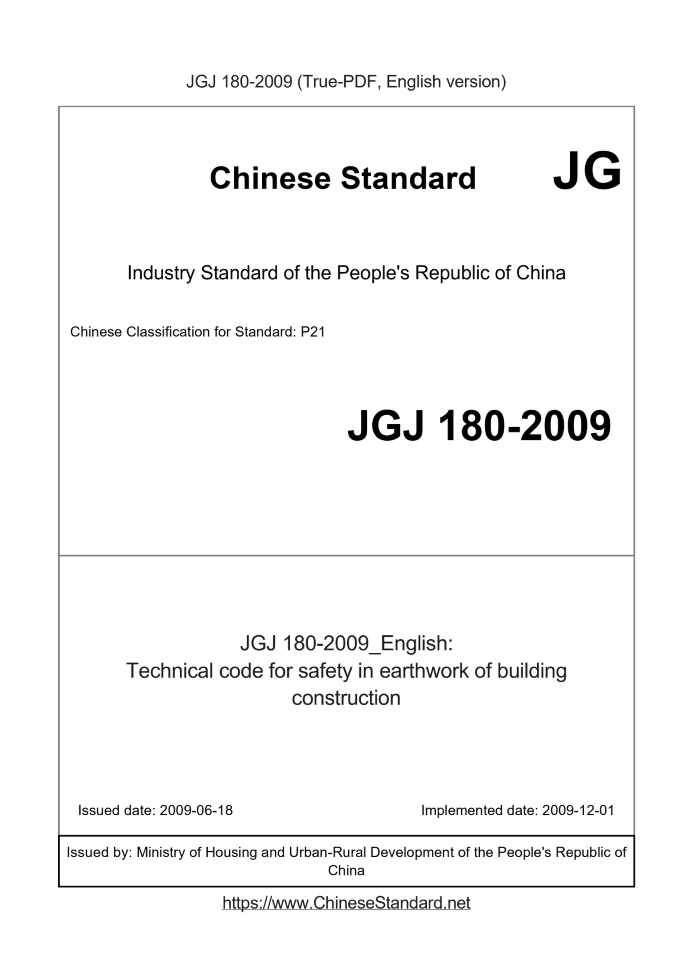 Delivery: <= 7 days. True-PDF full-copy in English will be manually translated and delivered via email. JGJ180-2009: Technical code for safety in earthwork of building construction Status: Valid
