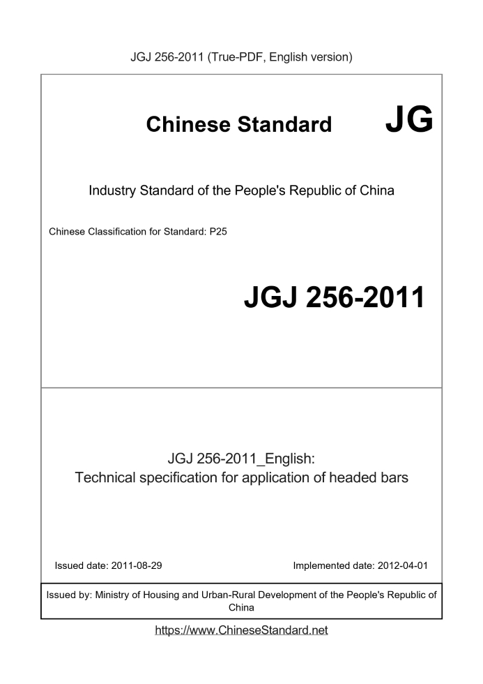 Delivery: <= 5 days. True-PDF full-copy in English will be manually translated and delivered via email. JGJ256-2011: Technical specification for application of headed bars Status: Valid