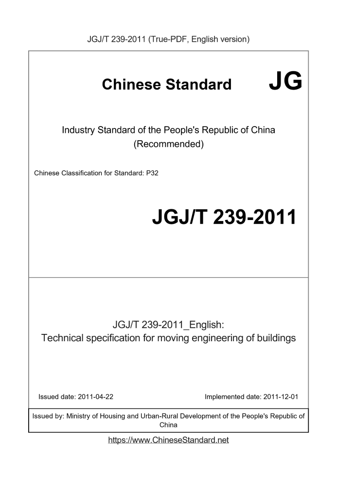 Delivery: <= 10 days. True-PDF full-copy in English will be manually translated and delivered via email. JGJT239-2011: Technical specification for moving engineering of buildings Status: Valid