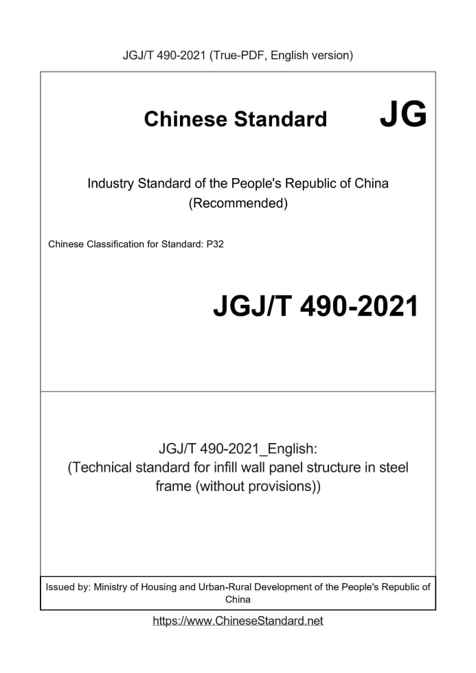 Delivery: <= 10 days. True-PDF full-copy in English will be manually translated and delivered via email. JGJT490-2021: (Technical standard for infill wall panel structure in steel frame (without provisions)) Status: Valid