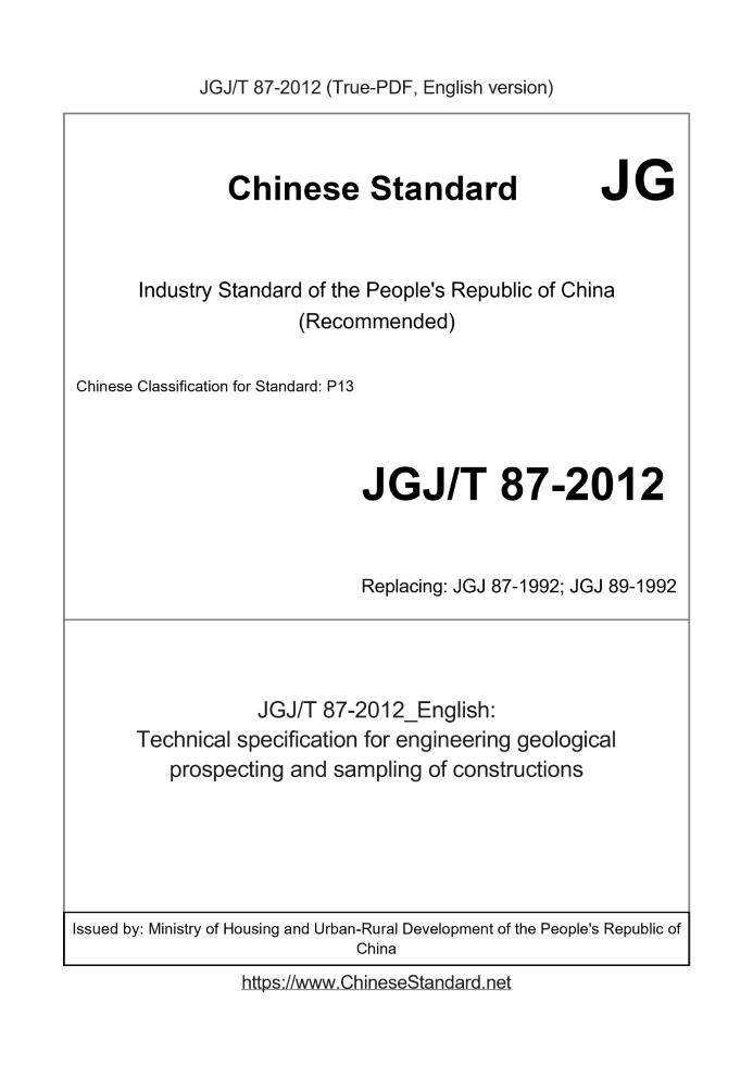 Basic dataStandard ID: JGJ/T 87-2012 (JGJ/T87-2012)Description (Translated English): Technical specification for engineering geological prospecting and sampling of constructions Sector / Industry: Building & Construction Industry Standard (Recommended) Classification of Chinese Standard: P13 Classification of International Standard: 93.020 Word Count Estimation: 107,125 Older Standard (superseded by this standard): JGJ 87-1992; JGJ 89-1992 Quoted Standard: GB 4285; GB/T 8321.1; GB/T 8321.2; GB/T 8321.3; GB/T 8321.4; GB/T 8321.5; GB/T 8321.6; GB/T 8321.7; GB/T 8321.8; GB/T 8321.9 Regulation (derived from): Ministry of Housing and Urban Notice No. 1230; Issuing agency(ies): Ministry of Housing and Urban-Rural Development of the People's Republic of China Summary: This standard applies to the construction of engineering geological exploration and sampling techniques work. Tips & Frequently Asked Questions:Question 1: How long will the true-PDF of JGJT87-2012_English be delivered?Answer: Upon your order, we will start to translate JGJT87-2012_English as soon as possible, and keep you informed of the progress. The lead time is typically 1 ~ 3 working days. The lengthier the document the longer the lead time.Question 2: Can I share the purchased PDF of JGJT87-2012_English with my colleagues?Answer: Yes. The purchased PDF of JGJT87-2012_English will be deemed to be sold to your employer/organization who actually pays for it, including your colleagues and your employer's intranet.Question 3: Does the price include tax/VAT?Answer: Yes. Our tax invoice, downloaded/delivered in 9 seconds, includes all tax/VAT and complies with 100+ countries' tax regulations (tax exempted in 100+ countries) -- See Avoidance of Double Taxation Agreements (DTAs): List of DTAs signed between Singapore and 100+ countriesQuestion 4: Do you accept my currency other than USD?Answer: Yes. If you need your currency to be printed on the invoice, please write an email to Sales@ChineseStandard.net. In 2 working-hours, we will create a special link for you to pay in any currencies. Otherwise, follow the normal steps: Add to Cart -- Checkout -- Select your currency to pay. |
