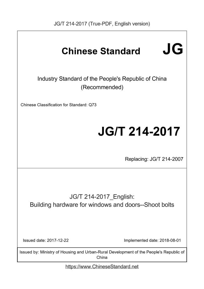 Delivery: <= 3 days. True-PDF full-copy in English will be manually translated and delivered via email. JG/T 214-2017: Building hardware for windows and doors--Shoot bolts Status: Valid JG/T 214: Historical versions