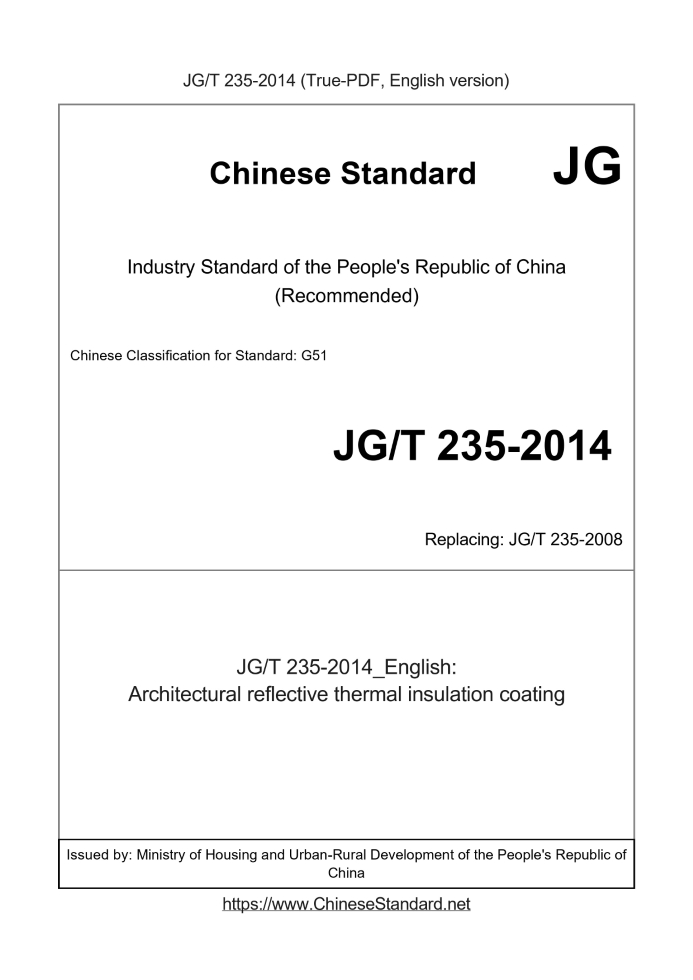 Delivery: <= 3 days. True-PDF full-copy in English will be manually translated and delivered via email. JG/T 235-2014: Architectural reflective thermal insulation coating Status: Valid JG/T 235: Historical versions