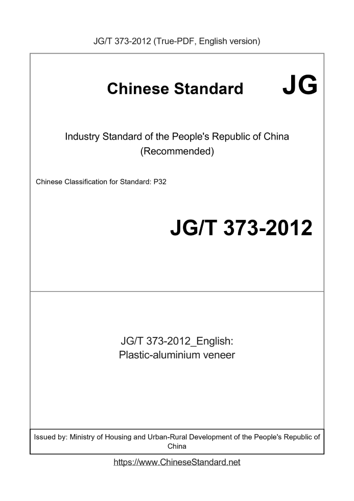 Delivery: <= 3 days. True-PDF full-copy in English will be manually translated and delivered via email. JG/T 373-2012: Plastic-aluminium veneer Status: Valid