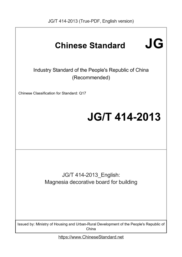 Delivery: <= 3 days. True-PDF full-copy in English will be manually translated and delivered via email. JG/T 414-2013: Magnesia decorative board for building Status: Valid