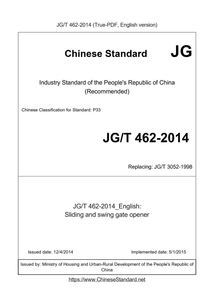 Delivery: <= 3 days. True-PDF full-copy in English will be manually translated and delivered via email. JG/T 462-2014: Sliding and swing gate opener Status: Valid