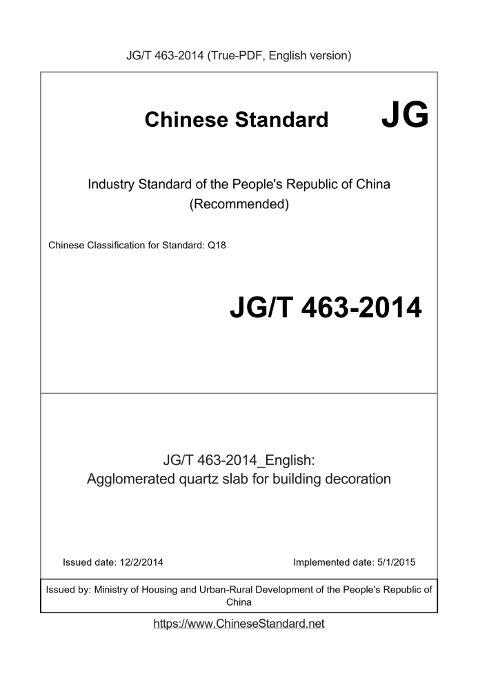 Delivery: <= 5 days. True-PDF full-copy in English will be manually translated and delivered via email. JG/T 463-2014: Agglomerated quartz slab for building decoration Status: Valid
