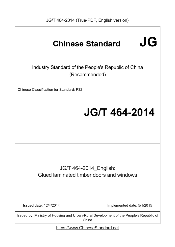 Delivery: <= 4 days. True-PDF full-copy in English will be manually translated and delivered via email. JG/T 464-2014: Glued laminated timber doors and windows Status: Valid