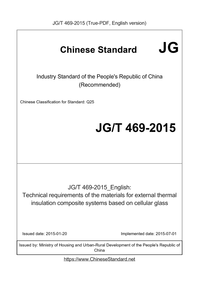 Delivery: <= 4 days. True-PDF full-copy in English will be manually translated and delivered via email. JG/T 469-2015: Technical requirements of the materials for external thermal insulation composite systems based on cellular glass Status: Valid