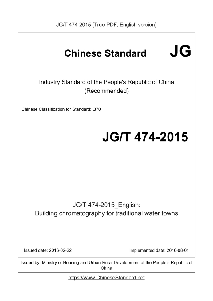 Delivery: <= 3 days. True-PDF full-copy in English will be manually translated and delivered via email. JG/T 474-2015: Building chromatography for traditional water towns Status: Valid
