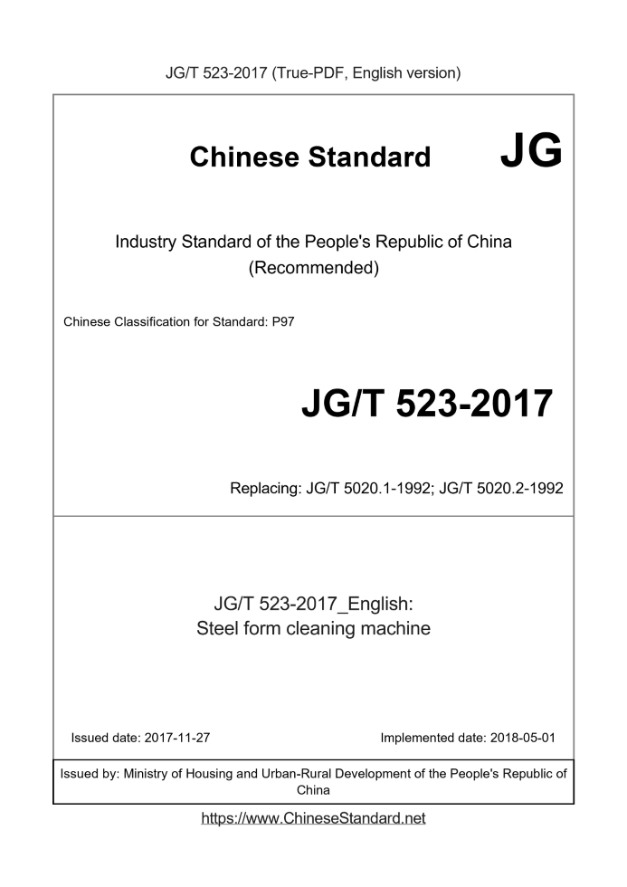 Delivery: <= 4 days. True-PDF full-copy in English will be manually translated and delivered via email. JG/T 523-2017: Steel form cleaning machine Status: Valid