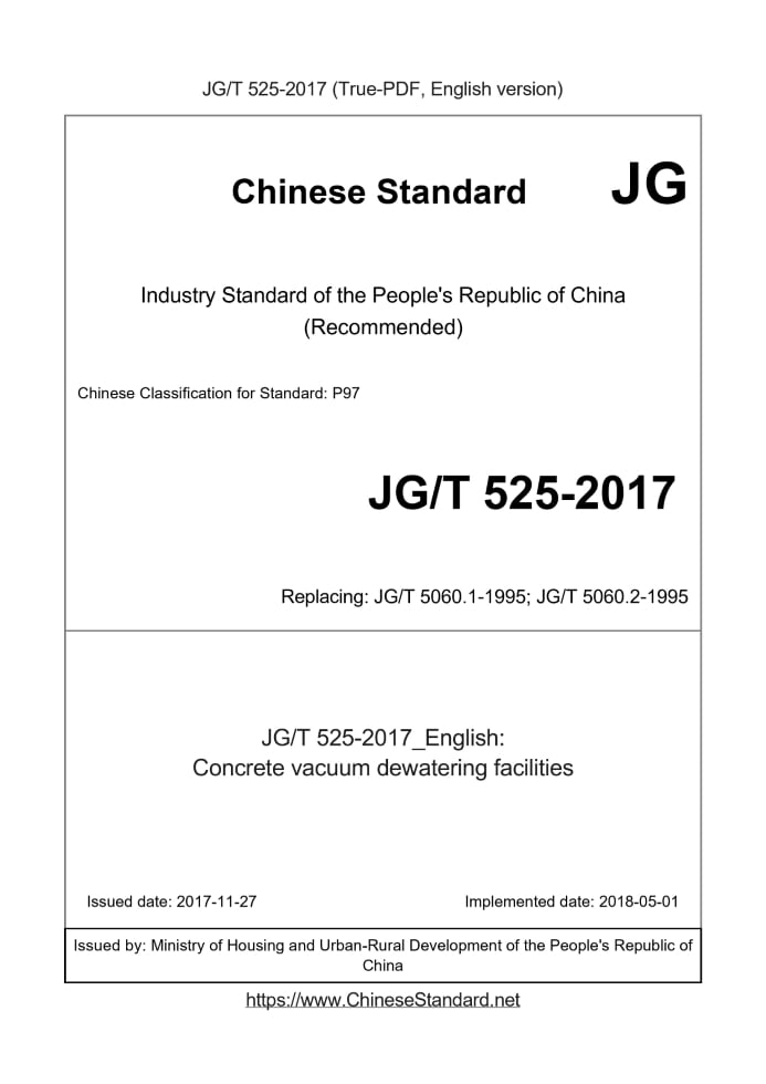 Delivery: <= 5 days. True-PDF full-copy in English will be manually translated and delivered via email. JG/T 525-2017: Concrete vacuum dewatering facilities Status: Valid