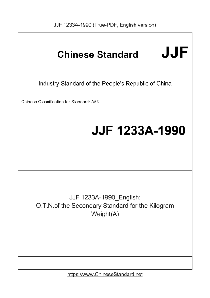 Delivery: <= 2 days. True-PDF full-copy in English will be manually translated and delivered via email. JJF1233A-1990: O.T.N.of the Secondary Standard for the Kilogram Weight(A) Status: Obsolete