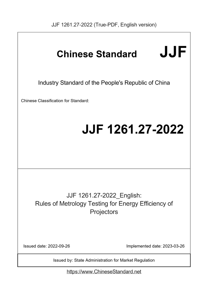 Delivery: <= 6 days. True-PDF full-copy in English will be manually translated and delivered via email. JJF 1261.27-2022: Rules of Metrology Testing for Energy Efficiency of Projectors Status: Valid
