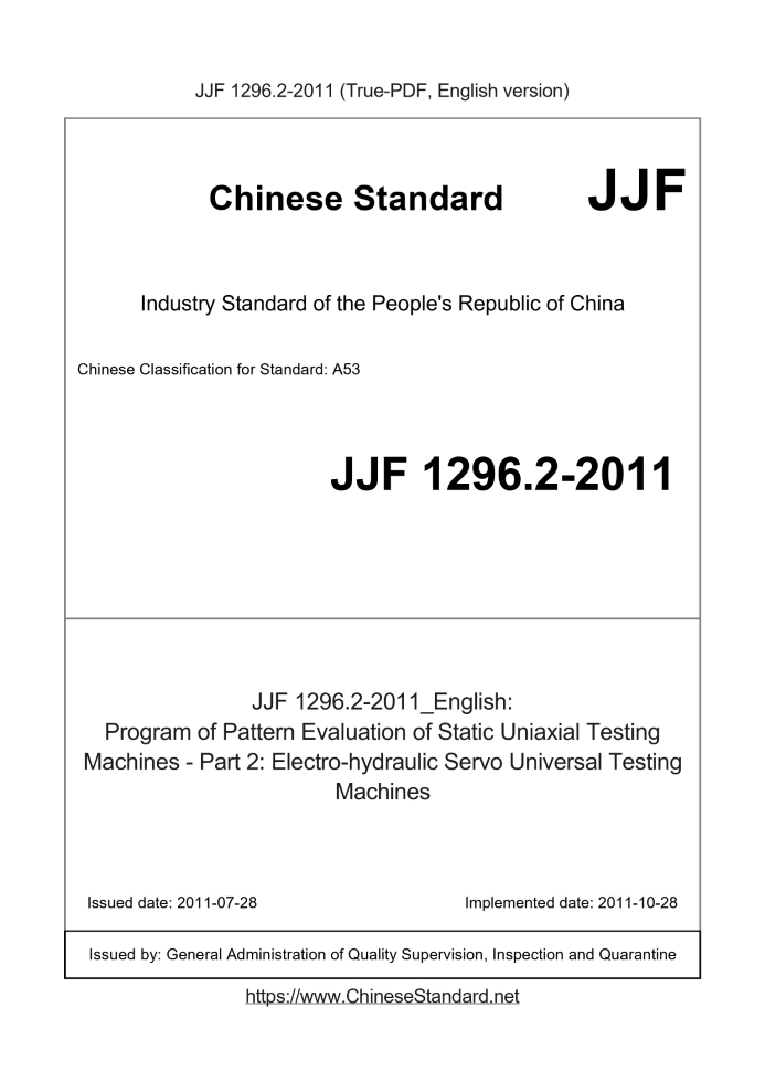 Delivery: <= 5 days. True-PDF full-copy in English will be manually translated and delivered via email. JJF 1296.2-2011: Program of Pattern Evaluation of Static Uniaxial Testing Machines - Part 2: Electro-hydraulic Servo Universal Testing Machines Status: Valid