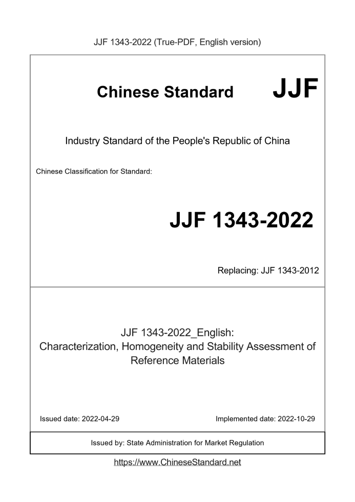 Delivery: <= 10 days. True-PDF full-copy in English will be manually translated and delivered via email. JJF 1343-2022: Characterization, Homogeneity and Stability Assessment of Reference Materials Status: Valid JJF 1343: Historical versions