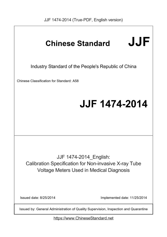 Delivery: <= 5 days. True-PDF full-copy in English will be manually translated and delivered via email. JJF 1474-2014: Calibration Specification for Non-invasive X-ray Tube Voltage Meters Used in Medical Diagnosis Status: Valid