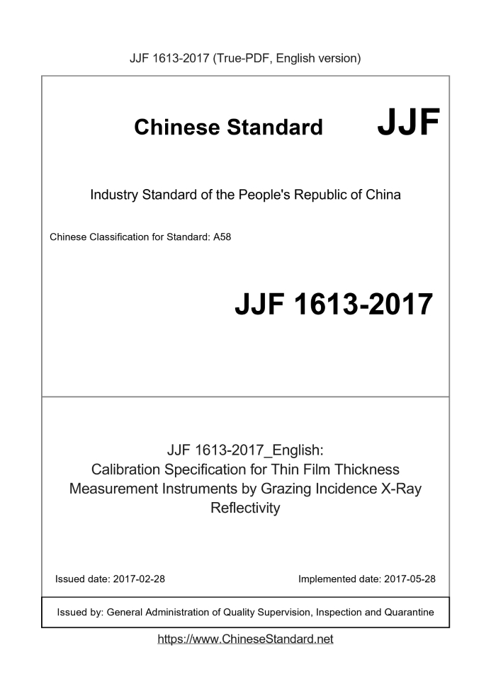 Delivery: <= 3 days. True-PDF full-copy in English will be manually translated and delivered via email. JJF 1613-2017: Calibration Specification for Thin Film Thickness Measurement Instruments by Grazing Incidence X-Ray Reflectivity Status: Valid