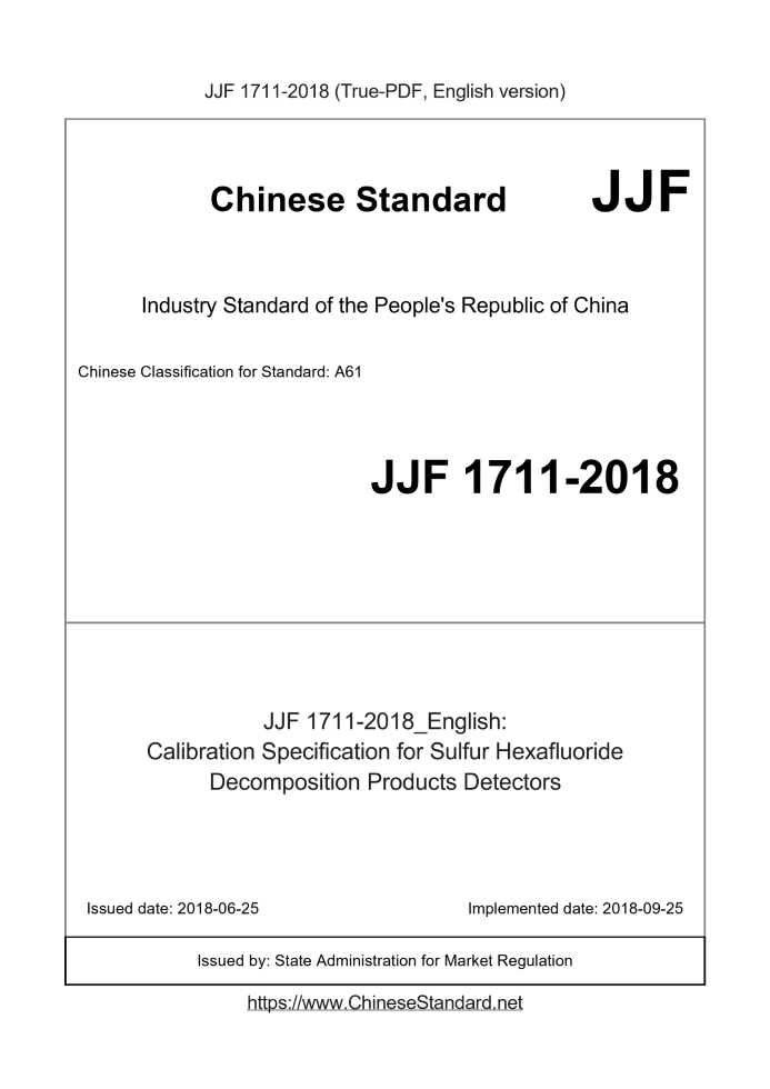 Delivery: <= 4 days. True-PDF full-copy in English will be manually translated and delivered via email. JJF 1711-2018: Calibration Specification for Sulfur Hexafluoride Decomposition Products Detectors Status: Valid