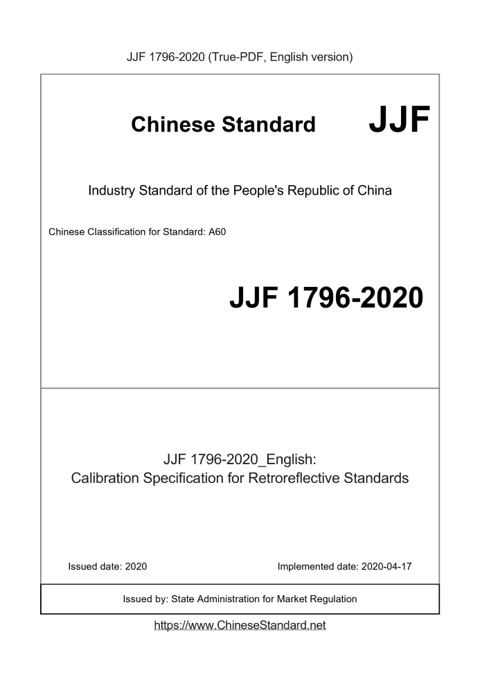 Delivery: <= 4 days. True-PDF full-copy in English will be manually translated and delivered via email. JJF 1796-2020: Calibration Specification for Retroreflective Standards Status: Valid
