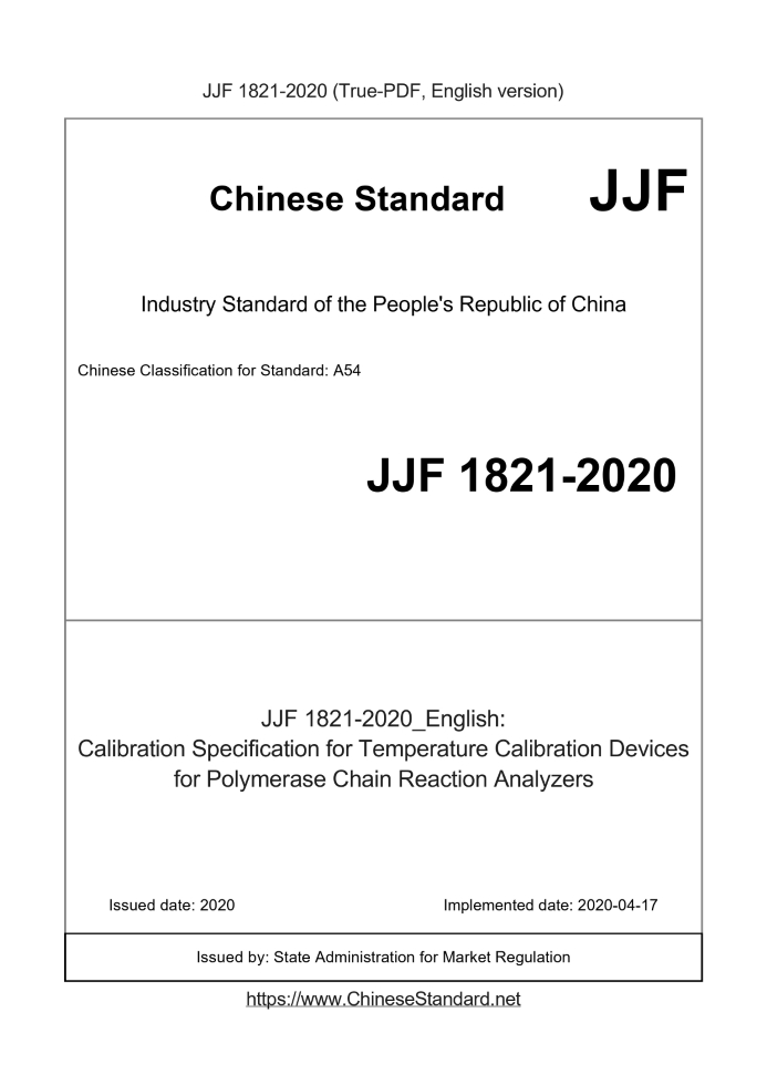 Delivery: <= 4 days. True-PDF full-copy in English will be manually translated and delivered via email. JJF 1821-2020: Calibration Specification for Temperature Calibration Devices for Polymerase Chain Reaction Analyzers Status: Valid