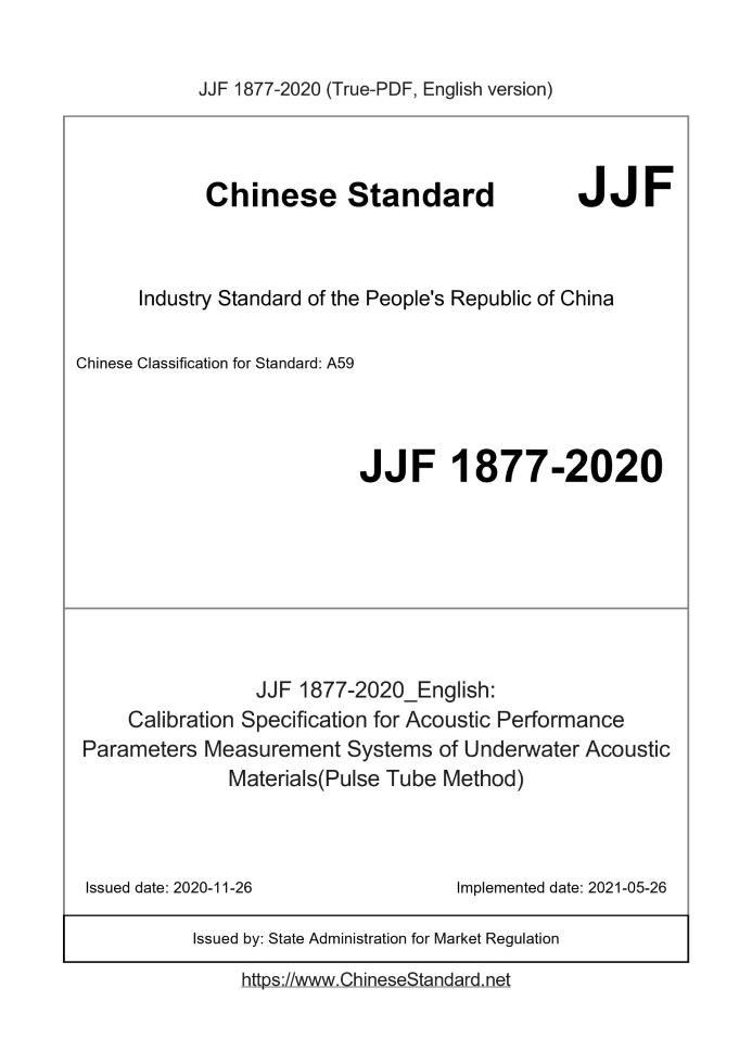 Delivery: <= 4 days. True-PDF full-copy in English will be manually translated and delivered via email. JJF 1877-2020: Calibration Specification for Acoustic Performance Parameters Measurement Systems of Underwater Acoustic Materials(Pulse Tube Method) Status: Valid