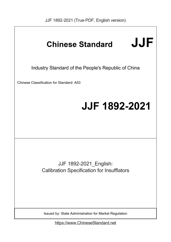 Delivery: <= 3 days. True-PDF full-copy in English will be manually translated and delivered via email. JJF 1892-2021: Calibration Specification for Insufflators Status: Valid